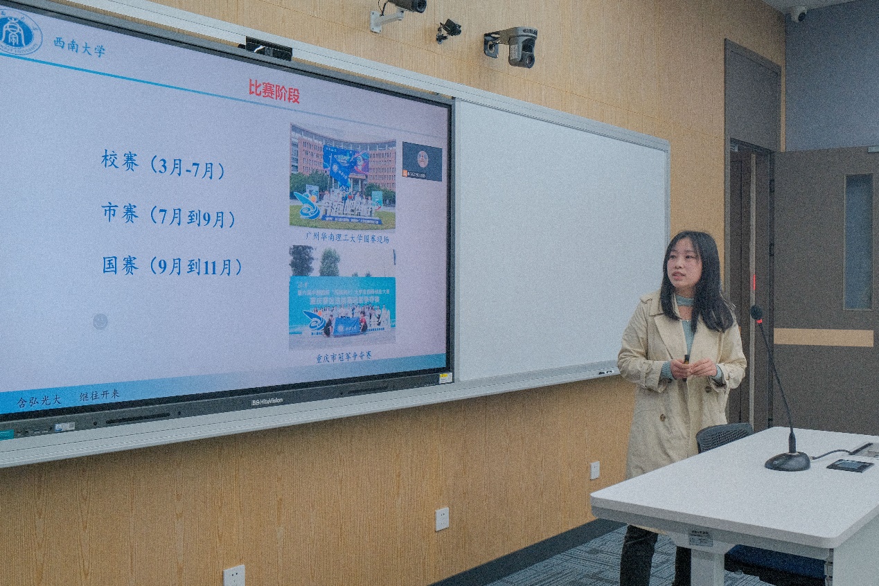 李鑫怡学姐结合自身参加“互联网+”创新创业大赛国赛并获银奖的经历,介绍了比赛各阶段时间节点、重点工作。她提到,每个团队应有明确研究领域并做好科学的团队分工,在比赛中讲好“核心故事”,打动评委。她还围绕两个角度分享了参加大赛的经验:一是 “软实力”的积累,参与比赛可以加深对本专业领域的理解,提升自身综合素质;二是 “硬通货”的收获,比赛获奖能为今后的学业和就业添上浓墨重彩的一笔。