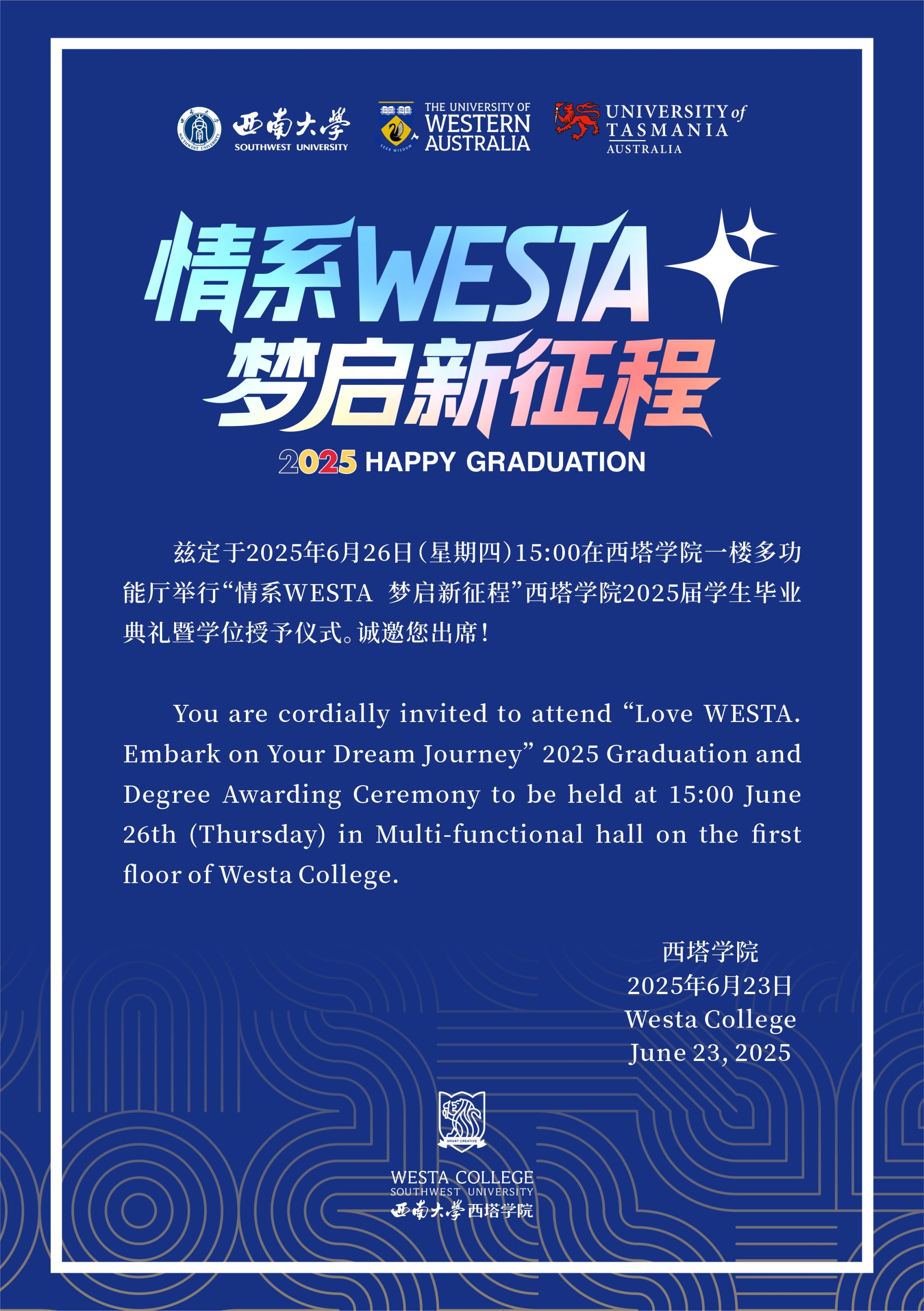 【情系WESTA 梦启新征程】2025届学生毕业典礼暨学位授予仪式邀请函请查收!